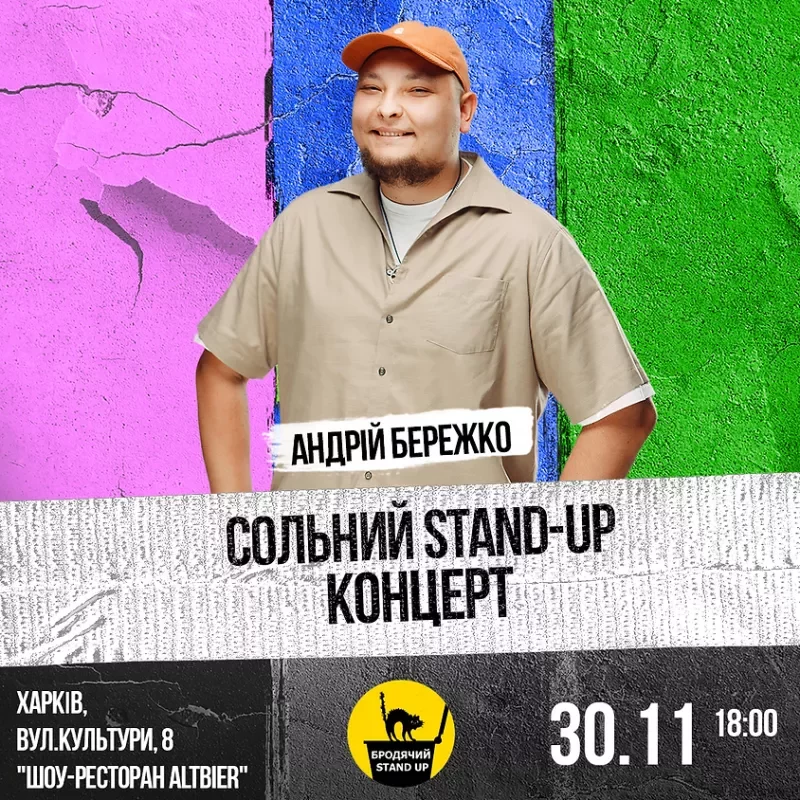 Сольний стендап концерт Андрія Бережка — це незабутня подія для всіх, хто цінує тонкий гумор, живе спілкування та справжні емоції. Андрій Бережко, талановитий комік з неперевершеним почуттям гумору, запрошує всіх на вечір, де можна посміятися від душі, занурившись у його спостереження за повсякденним життям, стосунками, абсурдністю сучасного світу та особистими пригодами.