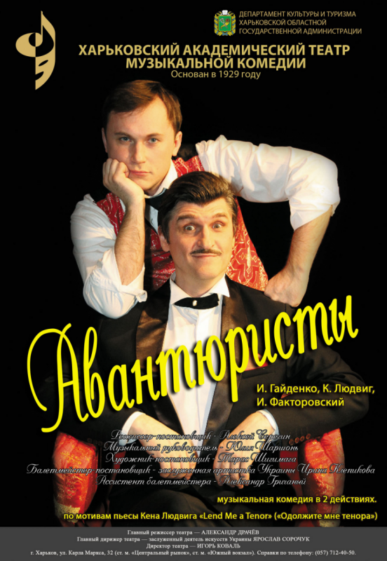Эстрадно-джазовые мелодии, написаны специально для этого спекталя харьковским композитором Игорем Гайденнко, кокетливые красавицы, роскошные костюмы (придуманы главным художником театра Тарасом Шигимагой) и экстравагантные танцы (хореография главного балетмейстера, заслуженной артистки Украины Ирины Клепиковой). Необычные мизансцены, перевоплощения героев, динамично выстроенный темпоритм спектакля режиссером-постановщиком Алексеем Серегиным. Занятный, легкий, остроумный и фееричный спектакль «Авантюристы» подарит Вам не только хорошее настроение, но и море положительных эмоций!