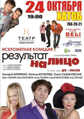 Успех спектаклю "Результат налицо" априори обеспечивает звездный состав актеров. Эта легкая, блестящая феерия заставит зрителя забыть о своих насущных проблемах и на пару часов погрузиться в атмосферу праздника.