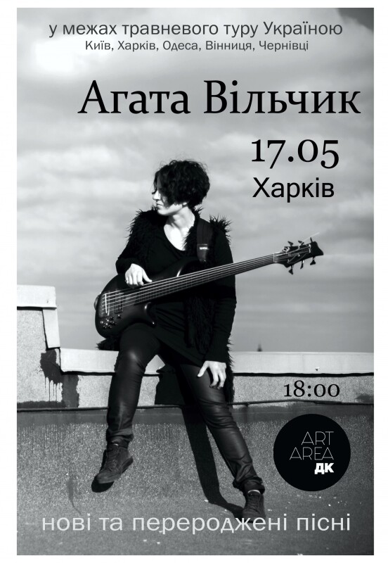 В рамках тура по Украине приглашаем на соло концерт Агаты Вильчик в Харькове. Новые и перерожденные песни будут звучать на украинском с гитарой, басом и спонтанными импровизациями.