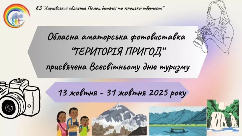 З метою популяризації туризму, виховання патріотичних цінностей особистості поваги до культурного та історичного минулого України, формування толерантного ставлення до інших народів, культур і традицій, популяризації туристсько-краєзнавчої, екскурсійної діяльності серед дітей та учнівської молоді закладів освіти з 13 жовтня по 31 жовтня 2025 року відбудеться обласна аматорська фотовиставка «Територія пригод 2025», присвячена Всесвітньому дню туризму.