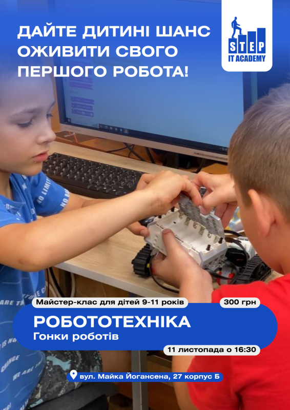 На майстер-класі діти 9-11 років створять власного робота-гонщика з LEGO EV3, навчаться керувати його рухом і змагатимуться у справжніх перегонах!