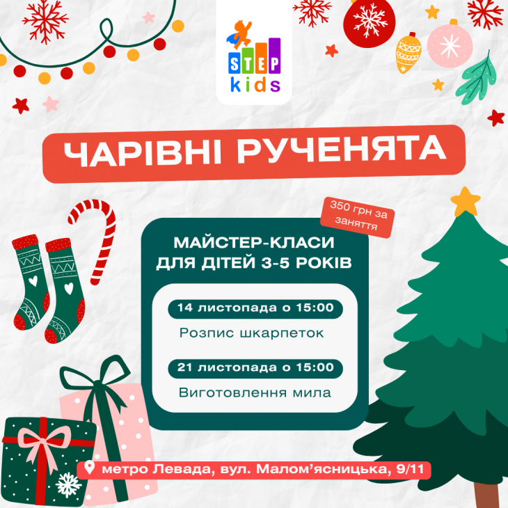 Розпис яскравих шкарпеток – теплий і персональний подарунок для близьких; Виготовлення ароматного мила у формі ялинки – маленькі дива своїми руками; Ігри та знайомства з однолітками у дружній атмосфері.