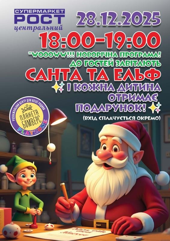 До дітей завітають Санта та Ельф , та кожна дитина отримає подарунок