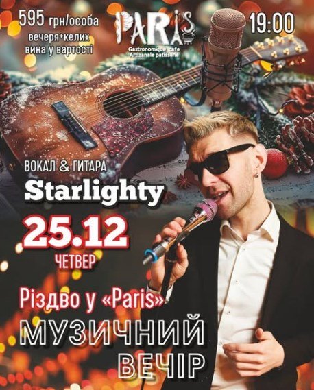 Проведіть цей святковий вечір у @cafe_paris_kh: смачна вечеря від нашого шеф-кухаря, чуттєвий та стильний вокал від @starlighty_ — насолодіться відпочинком в улюбленому ресторані ✨