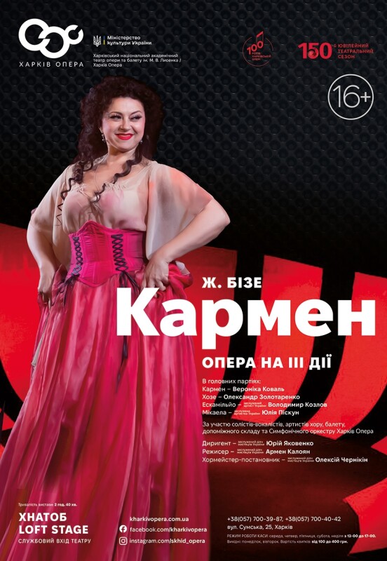 Главные партии исполняют: Вероника Коваль (Кармен), Александр Золотаренко (Хосе), Владимир Козлов (Эскамильо), Юлия Пискун (Микаэла).
