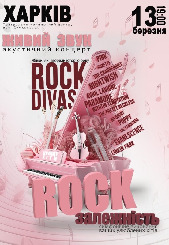 Если для вас Nightwish, Slipknot, Rammstein, Queen, Nirvana, The Cardigans, Evanescence, Imagine Dragons, Linkin Park и многие другие не просто слова, а повод, заставляющий ваше сердце биться ритмичнее, для вас концерт "Rock зависимость".