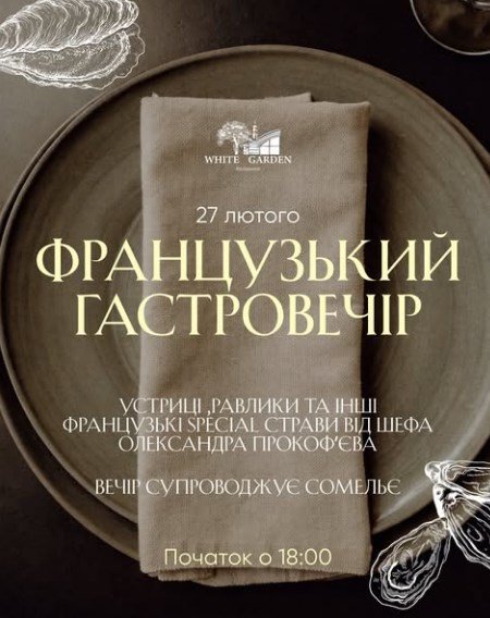 Запрошуємо вас до White Garden на особливу гастрономічну подію, де класика французької кухні поєднається з елегантною подачею та вишуканими винними акцентами.