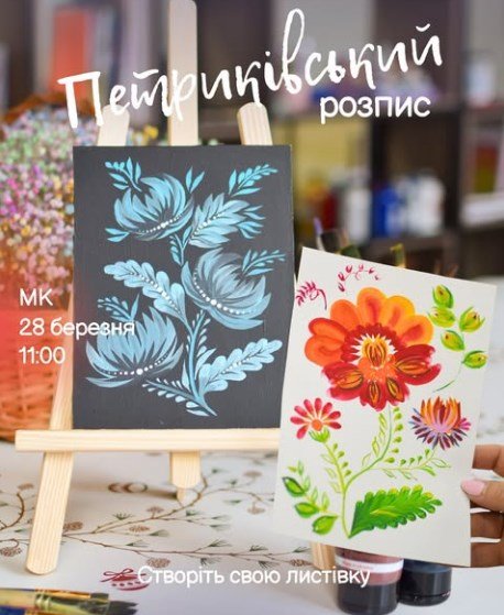 Запрошуємо вас на творчий МК, де ви зможете створити власну листівку у техніці петриківського розпису. На занятті ви познайомитеся з основними елементами розпису, навчитеся працювати з орнаментом і кольором та створите ніжну й унікальну роботу, яку можна подарувати або залишити собі.