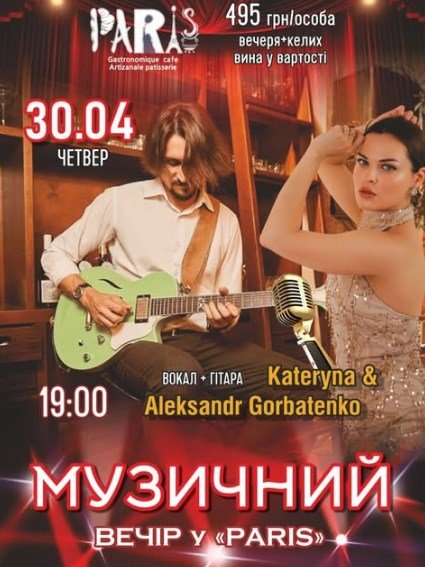 Проведіть романтичний вечір у @cafe_paris_kh: смачна вечеря від нашого шеф-кухаря та стильна музична програма від прекрасного дуету Kateryna & Aleksandr Gorbatenko — насолодіться відпочинком в улюбленому ресторані