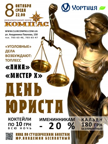 Профессиональный праздник людей, вся жизнь которых должна подчинена лозунгу «Знать право, служить праву, защищать право» Так вот, Ночной Клуб "Компас" представляет лучшую вечеринку для самых лучших 8 октября.