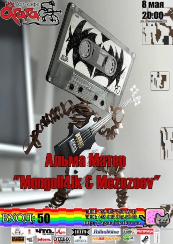 Известная харьковская группа Альма Матер - "Mongoll4ick & Mezozoev" снова приглашает вас на концерт в арт клуб Агата - 8 мая 2015 года. Импровизированное шоу от участников группы Alma Mater в акустическом варианте. Приятная атмосфера и дружеская обстановка не оставят вас равнодушными. Друзья и поклонники живой музыки мы Вас очень ждем!