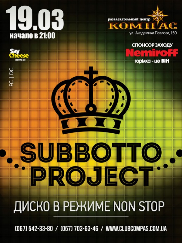 «Subbotto Project» вечеринка где по особенному присутствует атмосфера праздника, любовь к музыке, отличное настроение, зажигательных, узнаваемых и мелодичных ритмов на продолжении всей ночи, где танцы без остановок. «Subbotto Project» покажет, что значит энергетика в теле. Будь первым, не пропусти прочувствовать всю силу энергии уже в эту субботу 19 Марта. Диско в режиме Non Stop.