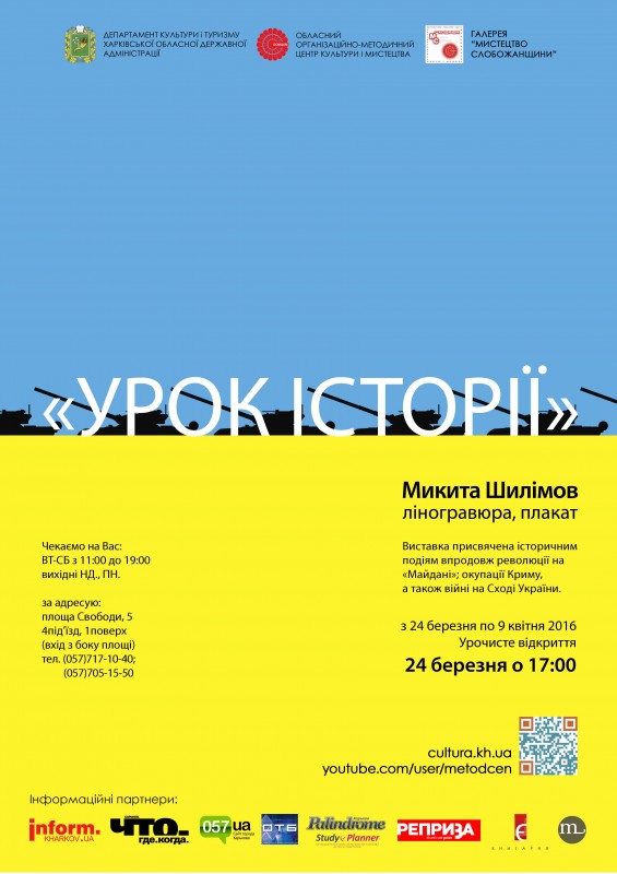 «Урок історії» — это уже не дебютная выставка Никиты. Дебют состоялся на родине авторав феврале этого года в Черкассах. Никита Шилимов создал выставку, не желая, чтобы его патриотизм измерялся в словах. Истории, говорит художник, собственно повторяться. Поэтому его работы — это память о том, чего нельзя снова допустить.