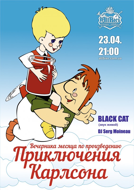 После нашумевшей театральной постановки - "Буратино", мы решили продолжать Вас радовать воспоминаниями из детства. И в субботу 23 апреля мы приглашаем Вас на вечеринку месяца по произведению "Приключения Карлсона". Готовьтесь к тому, что мы расскажем Вам историю о Карлсоне, который долетался!