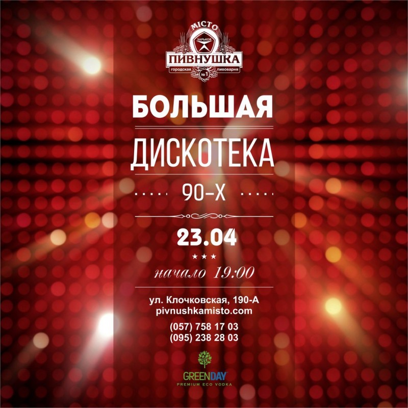 В программе вечера breakdance 90-х, тематические конкурсы и конечно хмельные подарки. Мы ждем Вас в самом гостеприимном ресторане нашего города пивнушка мисто на вечеринку большая дискотека 90-х !