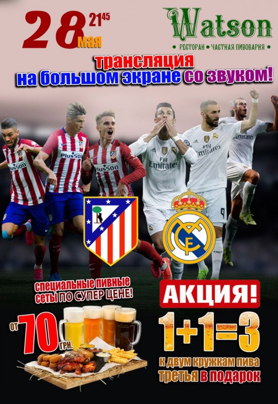 Ждем Вас в ресторане частной-пивоварни Watson . Болеем за любимую команду с лучшим немецким пивом!