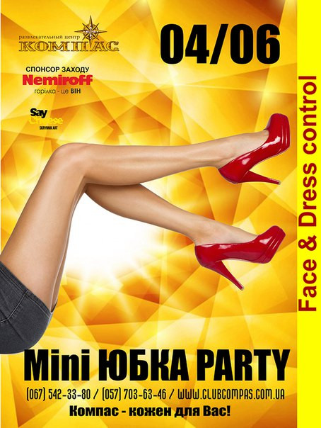 Мужчины! Такое пропустить невозможно! 4 июня для Вас в ночном клубе Компас ночь самых бурных фантазий. Ночь, когда фантазии и мечты сбываются. “Mini ЮБКА Party” в эту субботу. Конкурс на самую короткую мини юбку и мини платье, определим самих смелых и увереных в своей сексуальности девушек. Приветствуються девушки в мин юбках,а также в мини платьях. Одень свою самую короткую юбку в клуб КомпАС!