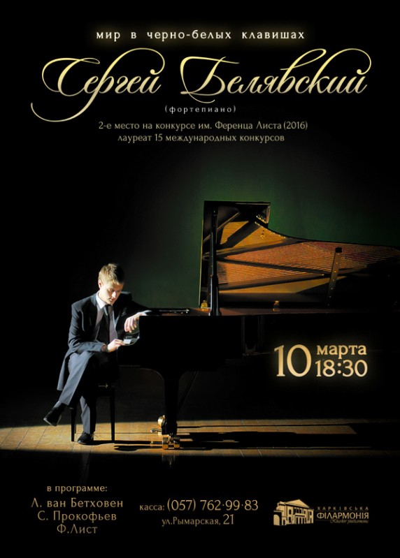 Фортепианная музыка в исполнении Сергея Белявского ( гран-при конкурса «EMUSE» 2015 (г. Афины, Греция), полуфиналист и обладатель специального приза "The Chairman of the Board's Prize"за лучшее исполнение произведений Ференца Листа Сиднейского Международного Конкурса Пианистов (2016 г., Австралия), лауреат 2-й премии и обладатель приза зрительских симпатий 49-го международного конкурса имени Листа в Венгрии (г. Будапешт) в 2016