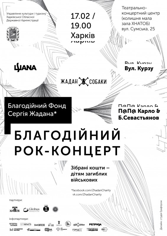 "Жадан и собаки", "Шана", "Ул. Курзу"," П@п@ Карло & Борис Севастьянов "и Олег Каданов — целая плеяда харьковских музыкантов сыграет на благотворительном рок-концерте 17 февраля в тетрально-концертном центре (бывшая малая сцена ХНАТОБ) по приглашению новосозданного Благотворительного фонда Сергея Жадана. Средства, собранные с помощью концерта, фонд передаст детям погибших украинских военных. Приобрести билеты можно непосредственно перед концертом или на сайте Карабас.ком: