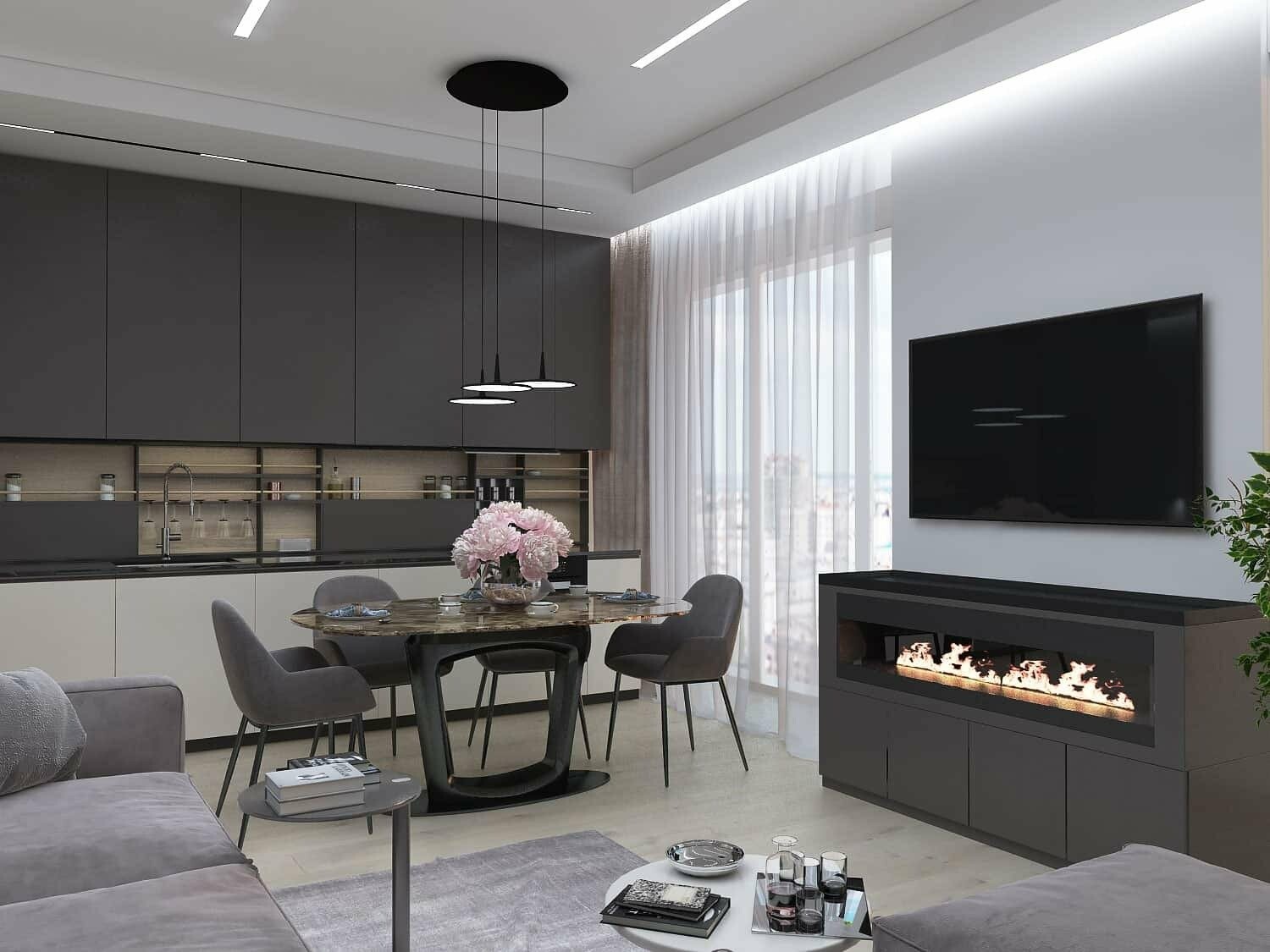 Важную роль играет свет и его распределение. Холодное освещение делает помещение функциональным, но не всегда комфортным. Теплый свет, наоборот, добавляет мягкости и глубины. Именно поэтому элементы, имитирующие живой огонь, так сильно влияют на восприятие пространства.