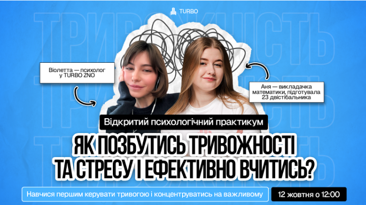 Вже 12 жовтня о 12:00, онлайн-школа TURBO ZNO запрошує учнів, батьків та всіх охочих на безкоштовний вебінар “Відкритий психологічний практикум. Як позбутись тривожності та стресу і ефективно вчитись?”.