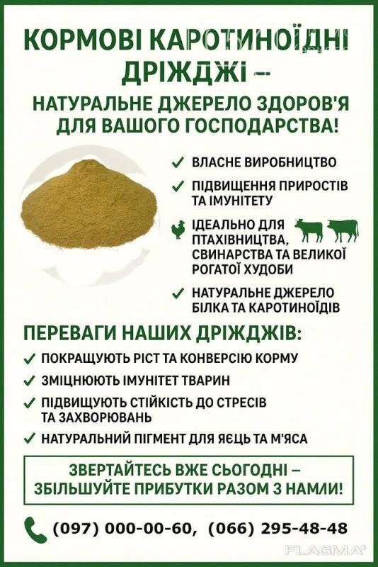 Дріжджі кормові каратиноїдні від виробника по Україні та на експорт. Дріжджі кормові каротиноїдні – натуральний білково-вітамінний продукт для збагачення поживного та функціонального складу раціону сільськогосподарських тварин та птиці всіх видів за рахунок насичення його необхідними білками, вуглеводами, вітамінами, макро- та мікро-елементами, є природним джерелом повноцінного білка та вітамінів групи В. За вмістом вітамінів, кормові дріжджі значно перевершують рибну, м'ясо-кісткове борошно та соєвий шрот. Амінокислоти, вітаміни груп: А, Е, D, C, ферменти, білок. Протеїн – 42%! Додавання кормових дріжджів сприяє прискоренню росту молодняку, збільшенню приросту ваги у поросят, телят і сільськогосподарської птиці, підвищенню несучості у курей, зниженню захворюваності курчат, каченят, гусенят, індичат, поліпшенню якості хутра у кроликів і хутрових звірів (нутрій ). Кормові дріжджі включають до складу комбікормів, преміксів та кормосумішей, що суттєво збільшити прирости ваги при економії корму до 20%. Кормові дріжджі збагачені ферментативним пробіотиком (комплексом живих бактерій), що допомагає засвоювати клітковину, що підвищує засвоюваність зернових кормів, а також пригнічує розвиток патогенних мікроорганізмів у шлунково-кишковому тракті. Застосування кормових дріжджів для ВРХ: - підвищує надої молока на 3,0-3,5 л на добу, а також збільшує вміст жиру в молоці на 0,4 - 0,6%. Норми застосування кормових дріжджів: для телят-молочників включають до раціону 100-200 г на добу, дійним коровам та бикам - до 0,5 кг на добу, молодняку ВРХ - 300 г на добу. Застосування кормових дріжджів для свиней: - збільшення м'язової маси, корисної ваги, допомагає виростити здорових і вгодованих тварин. Норми застосування кормових дріжджів для свиней: кнурам - 150-200 г на добу, поросним свиноматкам - 200-300 г на добу, підсосним свиноматкам - 300-500 г на добу, відгодівельним свиням - 100-150 г на добу 30-50 г на добу. Включення до раціону відгодівельних свиней 8-10% кормових дріжджів підвищує їх прирости на 15-20%. Застосування кормових дріжджів для сільськогосподарських птахів: - позитивно впливає на зростання, розвиток та продуктивність, стимулює активний набір ваги, підвищує продуктивність несучок на 25%. Норми застосування кормових дріжджів для сільськогосподарського птаха: кури-несучки – 5-8 г на добу, качки – 15-50 г на добу. Застосування 5% від загальної маси корму збільшує несучість курей-несучок на 21-40%, а додавання 10% - на 26-51%. Вартість кормових дріжджів каратиноїдних –14 500 грн. за 1 тонну.